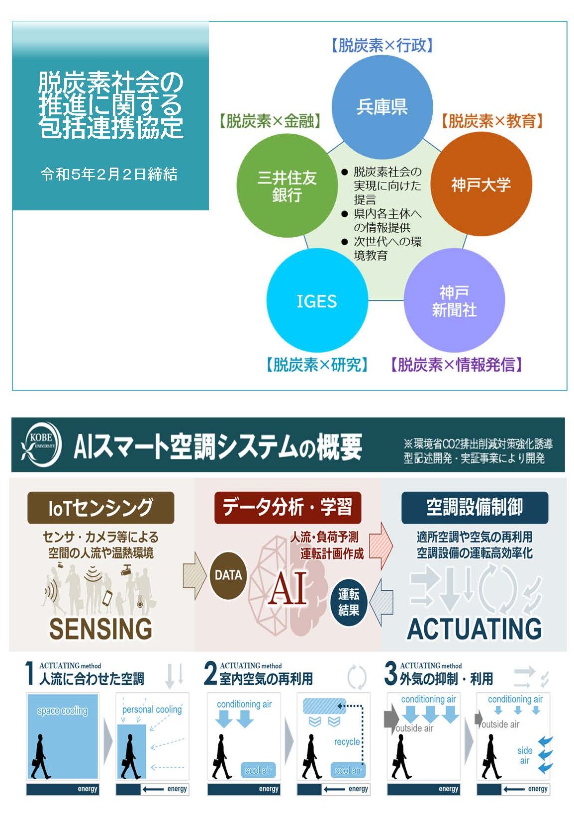 本学は「神戸大学 カーボンニュートラル基本方針」を策定し、2050年カーボンニュートラルの実現に向けて、研究・社会共創、教育、キャンパスの3本柱で推進しており、ステークホルダーと連携した広報・普及啓発を強化するとともに、本学が有する技術であるAIスマート空調システムの社会実装を加速します。