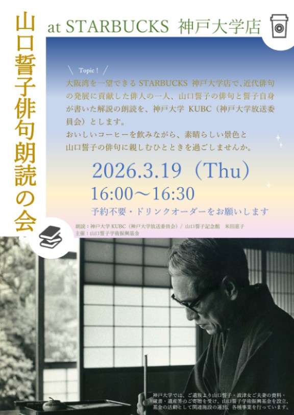 日 時:2026年3月19日(木) 16:00〜16:30 会 場:STARBUCKS 神戸大学店(六甲台第2キャンパス) 大阪湾を一望できるSTARBUCKS 神戸大学店で、神戸大学 KUBC(神戸大学放送委員会)と、近代俳句の発展に貢献した 俳人の一人、山口誓子の俳句と誓子自身が書いた解説の 朗読をします。 おいしいコーヒーを飲みながら、素晴らしい景色と 山口誓子の俳句に親しむひとときを過ごしませんか。 ※予約不要・ドリンクオーダーをお願いします チラシ(PDF形式) ・・・・・・・・・・・・・・・・・・・・・・・・・・・・・・・・・・・・・・・・・・・・・・・・・・・・・・・・・・・・・・・・・・・・・・ 山口誓子学術振興基金 講演動画 神戸大学では、山口誓子学術振興基金の活動として、公開講演会を実施しています。 一部講演会の様子は、大学公式Youtubeチャンネルで公開しています。 ロバート キャンベル 先生 早稲田大学特命教授・ 早稲田大学国際文学館(村上春樹ライブラリー)顧問 「その人の足あとふめば風薫る 山口誓子と正岡子規」 ◆第34回(2023)年 ◆第35回(2024)年 ◆第36回(2025)年 <お問い合せ先> 神戸大学研究推進部研究推進課研究推進グループ(TEL:078-803-5393) ===================================================================================== |
