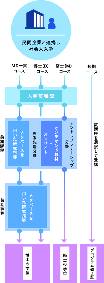 このような背景を踏まえ、本研究科では企業の個別の要望や社員のキャリアパスに応じて、多様な学位課程をマッチングするオーダーメイド型のアプローチを採用しています。このプログラムは、新分野での博士の学位取得、異なる分野での修士の学位取得、または再学習の機会として、企業や社員の特定の課題に対応するための柔軟性を持って設計されています。これにより、研究開発から始まり、事業推進の力を養うためのオーダーメイド型の学位プログラムを実施することが可能となります。 -