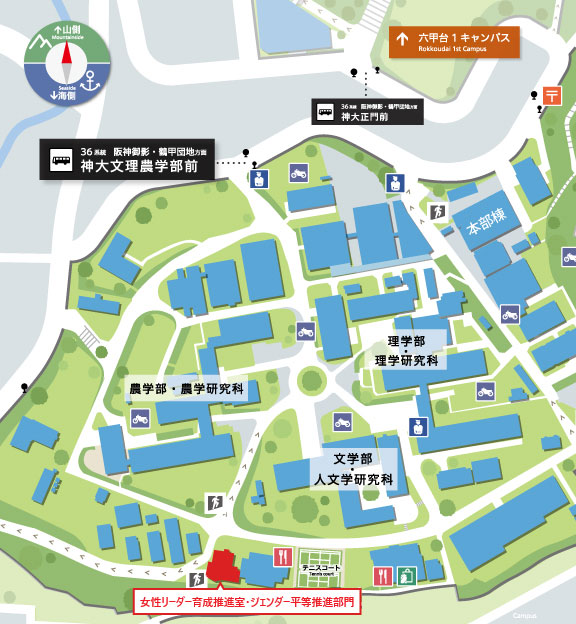 いずれの駅からも、バス36系統「鶴甲団地」行き で「神大文理農学部前」下車。南へ徒歩3分程度。眺望館2階が当部門 となります。