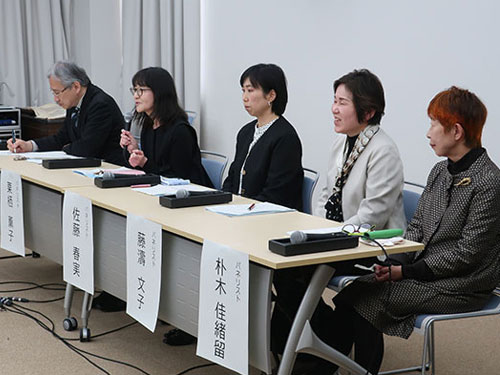 第2部では、女性リーダー育成推進室長の奥村弘理事・副学長がファシリテーターを務め、栗栖薫子法学研究科長、みらい開拓人材育成センター長の佐藤春実学長補佐、藤濤文子副学長、元人間発達環境学研究科長で元男女共同参画推進室長の朴木佳緒留名誉教授がパネリストとして登壇し、パネルディスカッションを行いました。管理職を務めてきたパネリストらは、自身のキャリアとこれまでの経験について述べるとともに、女性リーダーを増やす上での課題などについて意見交換を行い、会場参加者からの発言も加わって活発な議論がなされました。最後に、女性リーダー育成推進室副室長の野田和惠学長補佐による閉会挨拶で、シンポジウムの幕を閉じました。