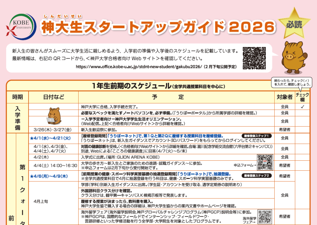 全学共通授業科目を中心とした、1年生前期(第1クォーターから夏休みまで)のスケジュールは、「神大生スタートアップガイド2026」で確認してください。